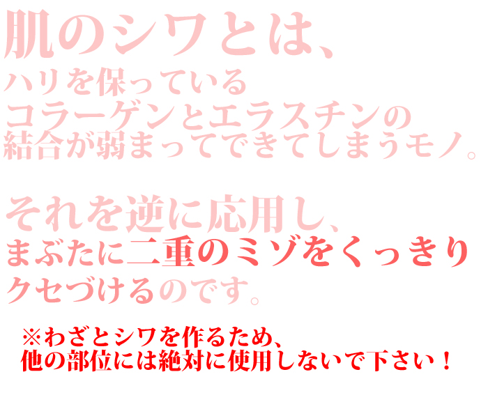 ○使用方法:トリートメントする方のまぶたを軽く閉じて、ふたえのラインを作りたい所を中心にまぶたを挟んで、1分間トリートメントを行ってください。